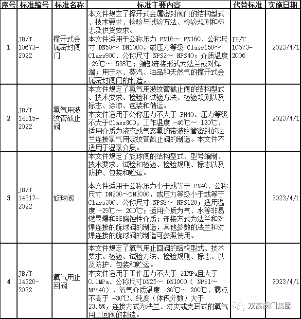 2022年10月20日,國(guó)家工業(yè)和信息化部發(fā)布2022年第23號(hào)公告,上海雙高閥門(mén)(集團(tuán))有限公司參與編寫(xiě)制定的4項(xiàng)閥門(mén)行業(yè)標(biāo)準(zhǔn)獲批準(zhǔn)發(fā)布,具體如下:
